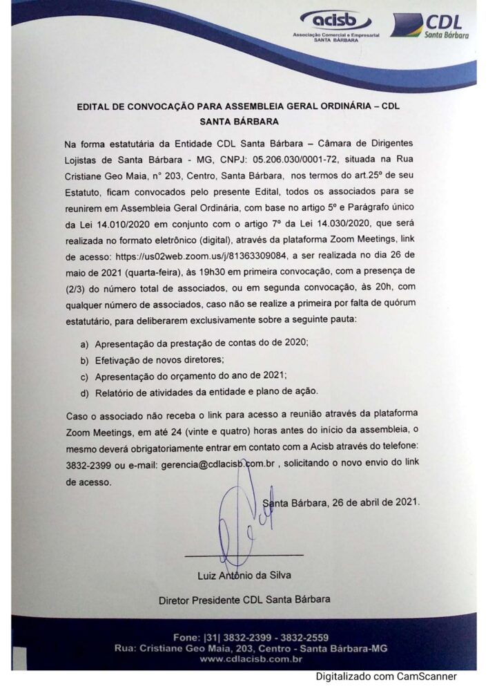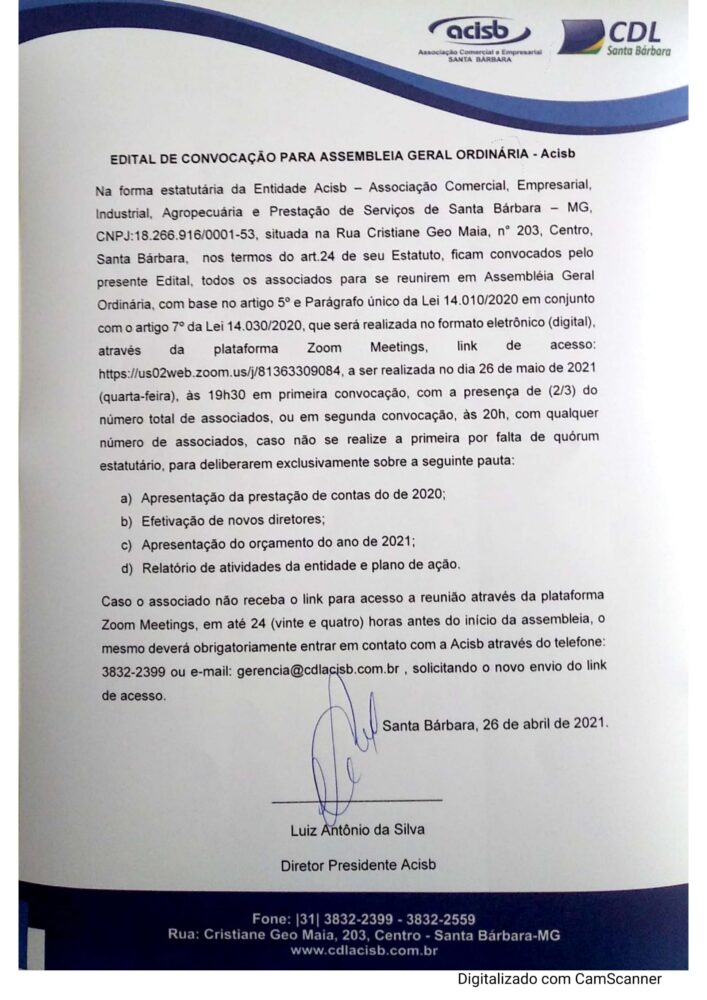 Convidamos todos os associados da Acisb/CDL para a Assembleia Geral Ordinária que acontecerá em primeira convocação no dia 26 de maio de 2021 (quarta-feira) às 19h30 e em segunda convocação às 20h, através da plataforma Zoom Meetings.