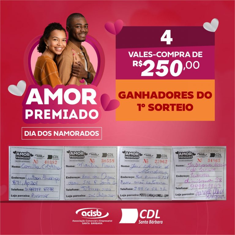 Os quatro ganhadores do primeiro sorteio da Campanha AMOR PREMIADO foram: 1-Camila Cristina que comprou na loja parceira Bramar Engenharia; 2-Marília Nunes que comprou na loja parceira D2 Calçados; 3-José Silvério de Mendonça que abasteceu no posto Shell; 4-Jussara Maria do Carmo que comprou no Varejão Olhos d’Água. Parabéns a
